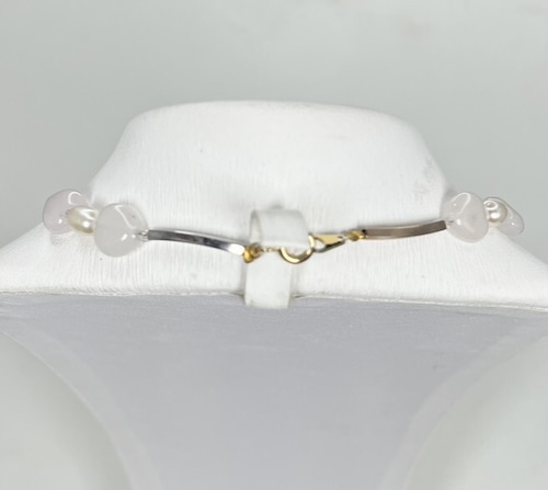 淡いピンクのローズクォーツと藍色の淡水パールが調和し、可愛らしくも大人っぽい印象を演出します。カジュアルなシーンでも特別な日にもぴったりのアクセサリーです。