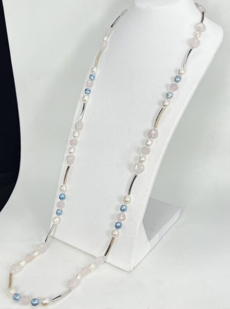 神秘的な美しさを持つ、ローズクォーツと藍染の淡水パールを使用した魅力的なネックレスです。