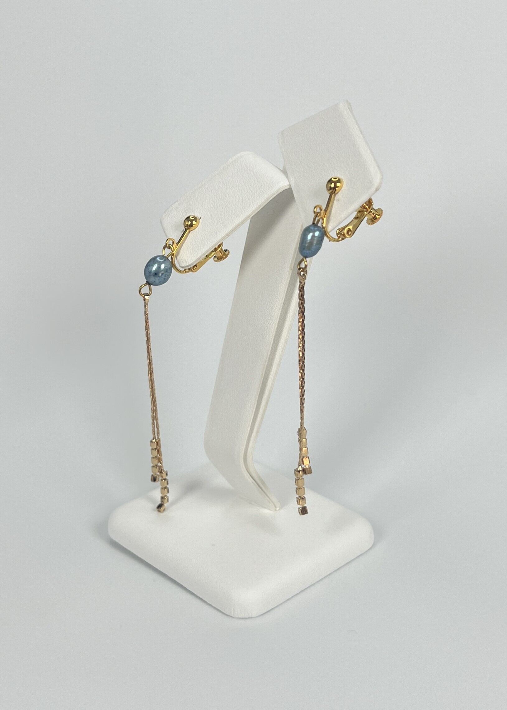耳元で華やかに揺れるゴールドのピアス・イヤリングは、独特の藍染パールが魅力を引き立てます。カジュアルな日常使いから特別な日の装いまで、さまざまなシーンでお楽しみいただけるアイテムです。