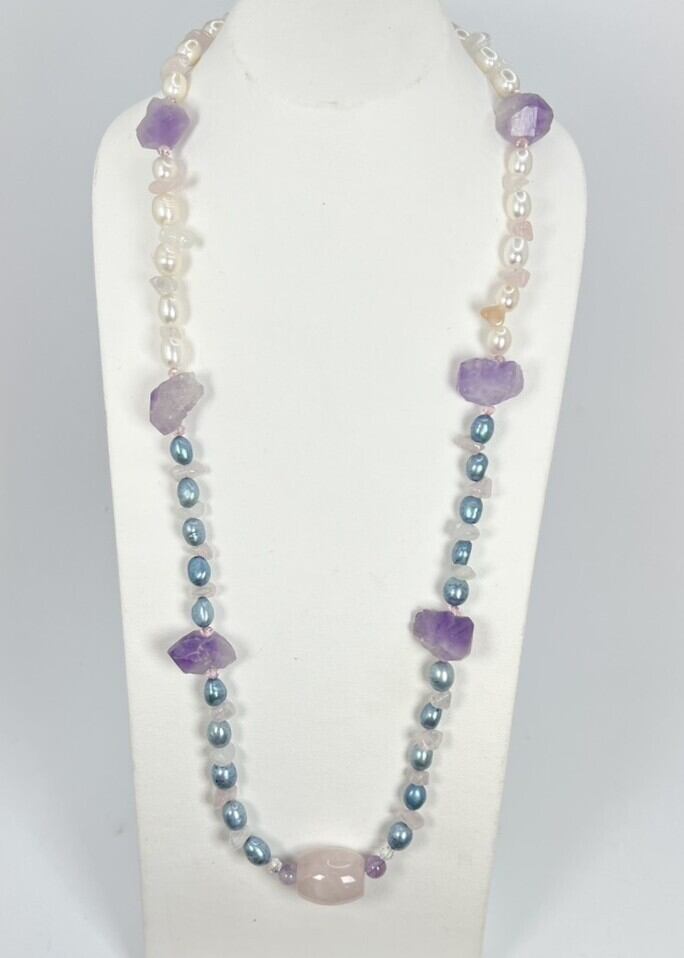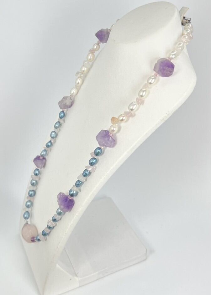 神秘的な美しさを持つ、アメジストと藍染の淡水パールを使用した魅力的なネックレスです。